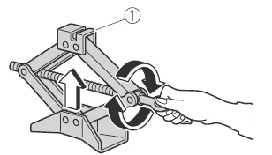 8. Drehen Sie die Wagenheberkurbel nach rechts, um das Fahrzeug gerade so hoch anzuheben, dass das Rad ausgewechselt werden kann. Kontrollieren Sie vor dem Entfernen der Radmuttern, ob das Fahrzeug sicher steht und nicht abrutschen kann.