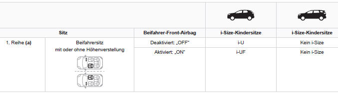 Gemäß den europäischen Vorschriften gibt Ihnen diese Tabelle Auskunft über die Möglichkeiten zum Einbau von i-Size-Kindersitzen auf den mit ISOFIXHalterungen ausgerüsteten und für i-Size zugelassenen Plätzen des Fahrzeugs.