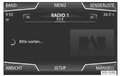 Der eingestellte DAB-Sender wird in der oberen Bildschirmzeile angezeigt, die gewählte Sendergruppe unter →Abb. 182.