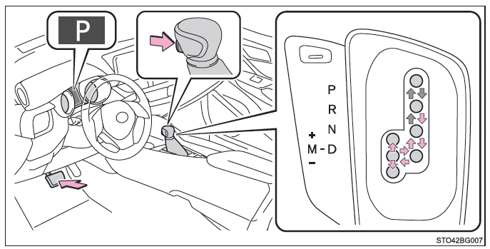 Fahrzeuge mit intelligentem Einstiegs- und Startsystem: Betätigen Sie das Bremspedal, während sich der Motorschalter im Modus IGNITION ON befindet, und bewegen Sie den Schalthebel, während Sie die Taste drücken.