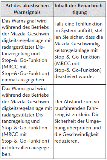▼ Warnfunktionen der Mazda-Geschwindigkeitsregelanlage mit radargestützter Distanzregelung und Stop-&-Go-Funktion (MRCC mit Stop-&-Go-Funktion)